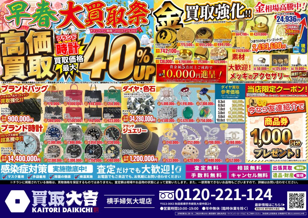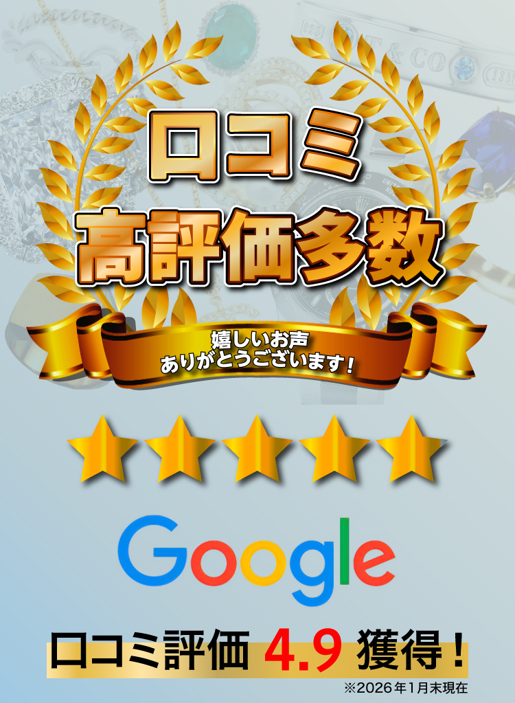 キャンペーン実施店舗 よくあるご質問 買取価格は主にどんな要素から決まるのでしょうか? お品物の状態や付属品の有無、最新相場、流通量などによって買取価格を算出します。 どんなものを買い取ってもらえますか? 金・貴金属・ブランド品はもちろん、お値段がつくか迷われているものも是非お持ちください。 傷や汚れのあるアイテムでも買取可能ですか? 大歓迎です。未使用品などのお持ち込みは少なく、傷や汚れのあるアイテムをお持ちいただく方が半数以上です。状態の悪いお品物やカビなどがあってもお買取可能なケースもございます。 どんな情報があればすぐに査定額を教えてもらえますか? お品物の名前や種類、状態、またはブランド名、型番などの情報があると、概ねの査定額をお伝えできるかと思います。 店舗での査定時間はどのくらいですか? お品物の種類や個数にもよりますが、約5分から30分ほどの査定時間となるケースが多いです。事前にある程度の査定時間をお伝えいたしますので、ご安心ください。